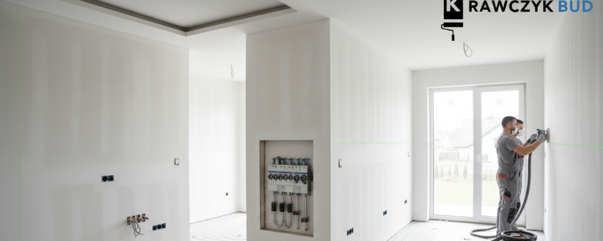 ZAKRES PRAC: Kompleksowe przygotowanie apartamentu do zamieszkania: przeróbki instalacji, gładzie oraz sufity podwieszane. WYZWANIE: Standardowe rozmieszczenie gniazdek i punktów wodnych nie odpowiadało nowemu projektowi kuchni i salonu. ROZWIĄZANIE: Wykonaliśmy precyzyjne bruzdowanie i przesunięcie instalacji elektrycznej oraz hydraulicznej (ogrzewanie podłogowe) bez naruszania struktury wylewek. EFEKT: Ściany przygotowane pod malowanie (standard Q3) oraz sufity podwieszane z przygotowanymi wnękami pod nowoczesne oświetlenie LED.